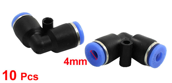 Product Name Quick Fittings Type 4mm to 4mm ( L Shaped) Material Plastic One Touch End Diameter 5mm/ 0.2" Dimension (Approx) 24 x 24 x 12mm/ 0.94" x 0.94" x 0.47" (L*W*H) Color Black, Blue Weight 34g Package Content 10 x Pneumatic Quick Fittings - Reviews