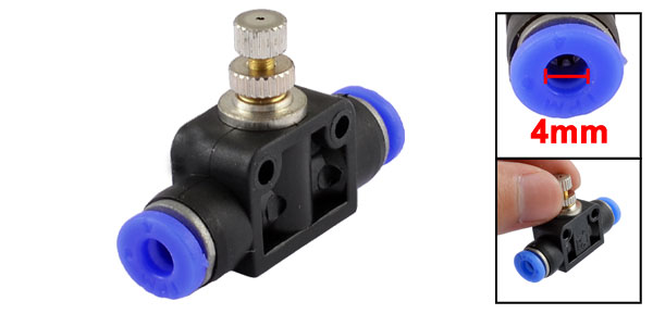 Product Name Pneumatic Speed Controller Connector Type 4mm to 4mm ( T-shaped) Total Size(Approx) 39 x 27 x 15mm/ 1.5" x 1.1" x 0.6" (L*W*T) External Material Plastic, Metal Color Black, Blue Weight 25g Package Content 1 x Pneumatic Speed Controller - Reviews