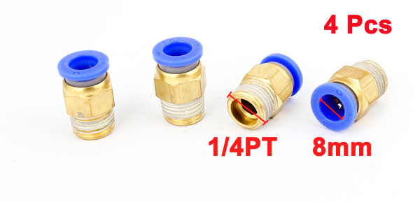 Product Name Quick Fittings Design Male Thread Straight Connect Type Male Thread 13mm/0.51"(1/4PT) Fit Tube Outside Dia 8mm/0.31"(5/16") Material Plastic, Metal Dimension (Approx) 16 x 16 x 23mm/ 0.63" x 0.63" x 0.91" (L*W*H) Color Brass Tone,Blue Weight 27g Package Content 4 x Quick Fittings - Reviews