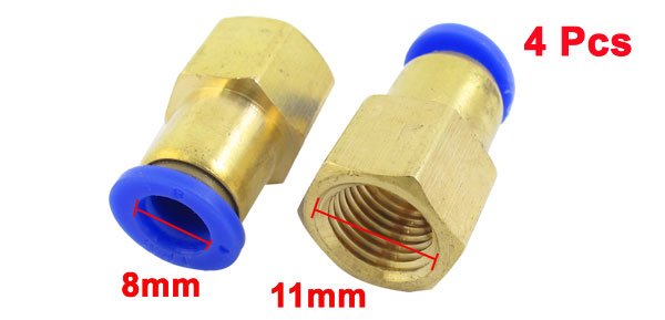 Product Name Quick Fitting Model PCF8-02 Female Thread Dia. 11mm/ 1/4PT Push in Pipe Dia(Blue End) 8mm/ 0.31" Total Size 29 x 17mm/ 1.1" x 0.65" (L*Max.D) Main Material Metal, Plastic Color Brass Tone, Blue Weight 81g Package Content 4 x Quick Fittings - Reviews