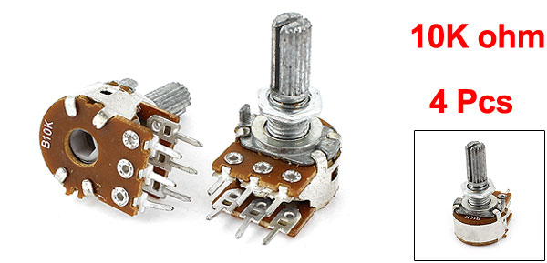 Product Name Potentiometer Model WH148 Type B10K Resistance Value 10K ohm Adjustment Type Top Adjustment Type Linear Dual(Type B) Features Knurled Shaft Pin Number 6 Shaft Diameter 6mm / 0.24" Rotary Shaft Legnth 13mm/0.51" Total Shaft Length 20mm / 0.79" Mounting Thread Diameter 7mm / 0.28" Base Size 17 x 9mm / 0.67"x 0.35"(D*T) Total Length 26mm / 1" Material Metal, Electronic Parts Weight 31g Package 4PCS x Potentiometers - Reviews