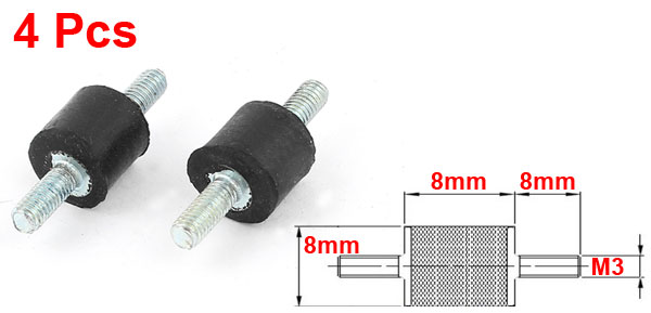 Product Name Rubber Vibration Isolator Mounts Material Metal, Rubber Thread Size (Approx.) M3 x 8mm (Dia.* L) Rubber Size (Approx.) 8 x 8mm / 3/8" x 3/8" (Dia.*H) Overall Height(Approx) 22mm / 0.87" Color Black, Silver Tone Weight 7g Package Content 4pcs x Rubber Vibration Isolator Mounts - Reviews