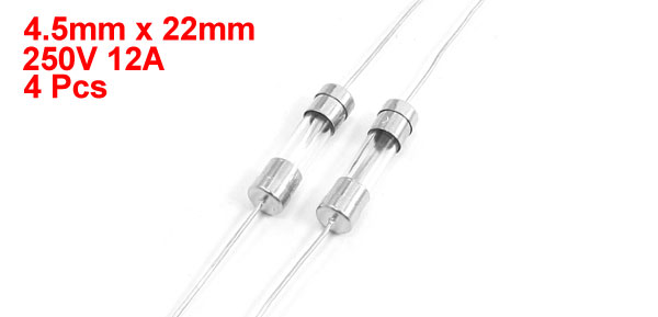 Product Name Glass Tube Fuses Rated Voltage 250V Rated Current 12A Dimension 4.5 x 22mm/ 0.18" x 0.87" (D*L) Total Length 9.5cm/3.7" Color Clear, Silver Tone Weight 5g Package 4 x Glass Tube Fuses - Reviews
