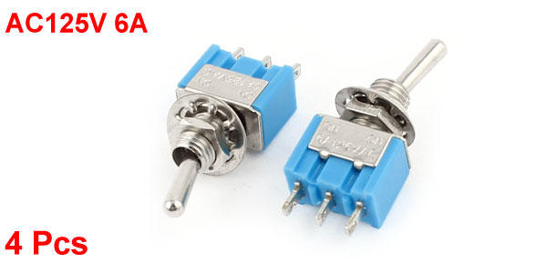 Details4PCS AC125V 6A 6mm Dia Panel Mount SPDT On/On Blue Toggle Switches  Product Name Toggle Switch Type SPDT Latching Position 2 Voltage & Current AC125V 6A Main Body Size 13 x 8mm/ 0.51" x 0.31"(L*W) Overall Height 33mm/ 1.3" Mounting Hole Diameter 6mm/ 0.24" Material Metal, Plastic Body Color Blue Weight 19g Package Content 4 x Toggle Switches