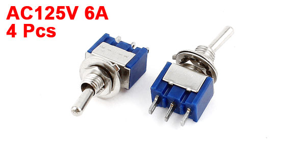 Product Name Toggle Switch Type SPDT Latching Position 3 Voltage & Current AC125V 6A Main Body Size 13 x 8mm/ 0.51" x 0.31"(L*W) Overall Height 33mm/ 1.3" Mounting Hole Diameter 6mm/ 0.24" Material Metal, Plastic Body Color Blue Weight 22g Package Content 4 x Toggle Switches - Reviews