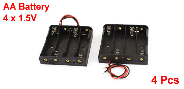 Details4pcs Black Battery Storage Box Case Holder for 4 x 1.5V AA Batteries  Product Name Battery Case Holder Body Size 6 x 5.6 x 1.5cm / 2.4" x 2.2" x 0.6"(L*W*H) Cable Length( Each ) 15cm/ 5.9" Battery Type for 4 x 1.5V AA Batteries (Batteries are not included) Rated Voltage 1.5V Material Plastic, Metal Color Black Total Net Weight 62g Package Content 4 x Battery Case Holder