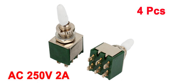 Action Type Latching Pin Number 6 Pins Position 2 Positions (ON/ON) Type DPDT Thread Diameter 6mm / 0.24" Body Size (Approx.) 13 x 12 x 10mm / 0.51" x 0.47" x 0.4" (L*W*T) Total Height 35mm / 1.4" Material Plastic, Metal Color Green, Silver Tone Weight 25g Package Content 4 x Toggle Switch - Reviews