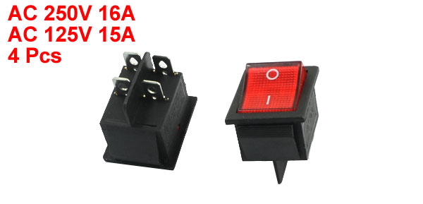 4Pcs DTST ON/OFF 4Pin Red Lamp Rectangle Rocker Switch AC250V 16A AC125V 15A