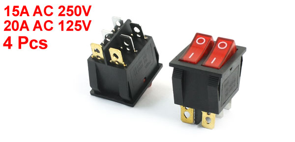 4Pcs Dual SPST 6Pin Red Lamp Rectangle Boat Rocker Switch AC250V 15A AC125V 20A