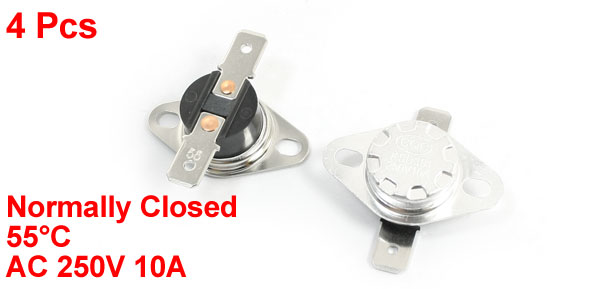 Details4Pcs KSD301 55C Celsius NC Temperature Control Switch AC250V 10A  Product Name Temperature Control Switch Model.No KSD301 Action Type Normally Closed(NC) Action Temperature 55°C Voltage & Current AC 250V, 10A Total Size (Each) 34 x 18 x 12mm / 1.3" x 0.71" x 0.47"(L*W*H) Mounting Hole Size 4.5 x 3.5mm/0.18" x 0.14"(L*W) Material Metal, Plastic Color Black, Silver Tone Total Weight 19g Package Content 4 x Temperature Control Switches