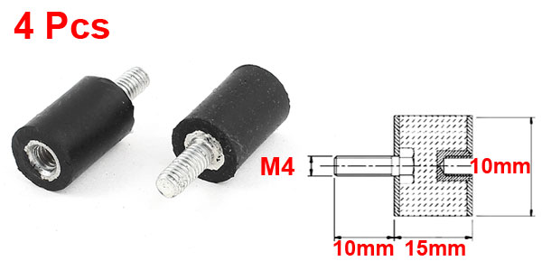 Product Name Rubber Vibration Mount Male Thread Size M4 x 10mm(Dia.*L) Female Thread Size M4 x 5mm(Dia.*L) Rubber Size 10 x 15mm /0.4" x 0.6" (Dia.*H) Material Metal, Rubber Color Black, Silver Tone Weight 15g Package Content 4Pcs x Rubber Vibration Mounts - Reviews