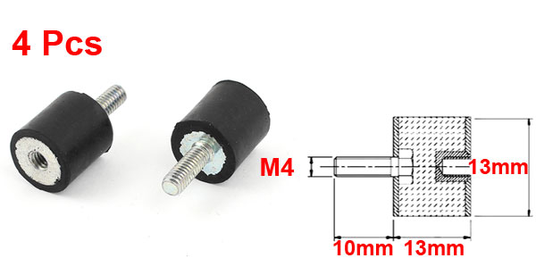 Product Name Rubber Vibration Isolator Mounts Material Metal, Rubber Male Thread Size (Approx.) M4 x 10mm(Dia.* L) Female Thread Size(Approx.) M4 x 6mm(Dia.* L) Rubber Size (Approx.) 13 x 13mm / 0.5" x 0.5" (Dia.*H) Overall Height(Approx) 25mm / 1" Color Black, Silver Tone Weight 22g Package Content 4pcs x Rubber Vibration Isolator Mounts - Reviews