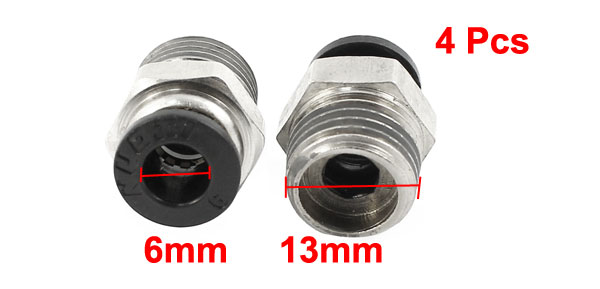 Product Name Quick Fittings Thread Diameter 13mm/1/4PT Inner Diameter (Black End) 6mm/ 0.2" Total Size 19.5 x 14mm/ 0.8" x 0.55" (L*Max. D) Material Metal, Plastic Color Silver Tone, Black Net Weight 40g Package Content 4 x Quick Fittings - Reviews