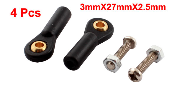 Details4Pcs RC Car Black 3X27X2.5mm Rod End Metal Ball Head Buckle Joints Set w Screws  Product Name Ball Buckle Set Rolling Metal Balls Diameter 6mm/0.24" Ball Hole Diameter 3mm/0.12" Round Head Diameter 10mm/0.43" Total Length 27mm/1.1" Thread Hole Diameter 2.5mm/0.10" Weight 10g Material Plastic, Metal Color Black Package Content 4 x Ball Buckle Set