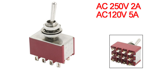 Product Name Toggle Switch Model T004 Type 4PDT (Latching) Position 3 Positions(ON/OFF/ON) Voltage, Current AC 250V 2A