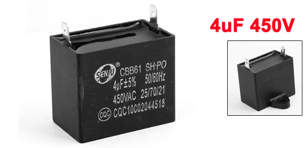 Product Name Motor Capacitor Housing Material Plastic Dielectric Material Metallized Polypropylene Film Model CBB61 Capacitance 4uF Tolerance ±5% Rated Voltage 450VAC Frequency 50/60Hz Temperature 25/70/21 Pin Spacing(Approx.) 4.25cm/1.67 Overall Size 4 x 3.5 x 3.5cm/1.6" x 1.4" x 1.4"(L*W*H) Color Black Weight 33g Package Content 1 x Motor Capacitor - Reviews