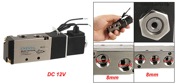 Product Name Solenoid Valve Model 4V110-06 Type 5 Ways 2 Positions Contact Type Screw Terminal Material Metal, Plastic Voltage DC 12V Operating Pressure 1.5 - 8 kgf/cm² Port Inner Dia.(Each) 8mm/ 0.31" Total Size (Approx.) 9.8 x 2.7 x 1.8cm / 3.8" x 1.1" x 0.7"(L*W*T) Cable Length 30cm / 11.8" Color As Picture Shown Weight 108g Package Content 1 x Solenoid Valve - Reviews