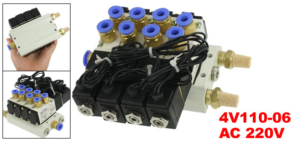 4V110-06 AC 220V Quadruple Solenoid Valve Mufflers 6mm Quick Fittings Base Set