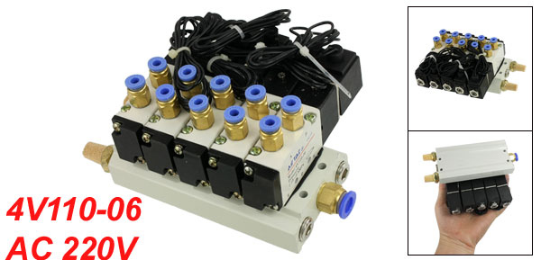 4V110-06 AC 220V Quintuple Solenoid Valve Mufflers 4mm Quick Fittings Base Set