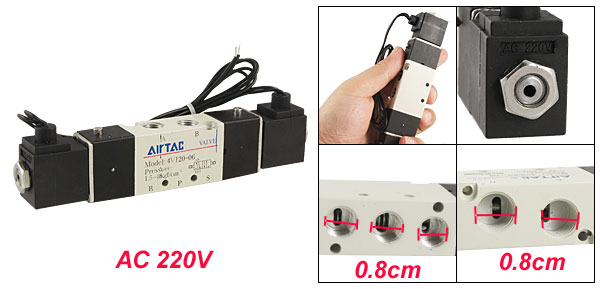 Type 5 Way 2 Position Double Head Type Power Consumption AC 220V Pressure 1.5-8kgf/cm² Joint Bore Size(Approx) Inlet=Outlet=Exhaust=PT1/8 Threaded Port Size(Approx) A=B=P=R=S=0.8cm / 0.315" Cable Length(Approx) 43cm / 16.9" Overall Size(Approx) 13.8 x 1.8 x 3.3cm / 5.4" x 0.7" x 1.3" (L*W*H) Color White, Black Weight 157g Package Content 1 x Solenoid Valve - Reviews