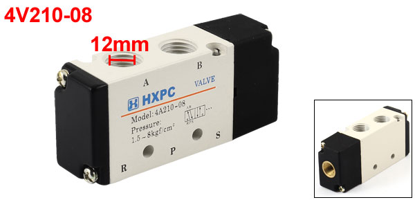 Product Name Air Control Pneumatic Valve Model No. 4A210-08 Working Pressure 1.5~8kgf/cm2 Type 4 Ways 2 Position 5 Ports Brass Tone End Thread Dia. 9mm / 1/8PT Threaded Port Size(Approx.) Inlet Port (P) :12mm / 1/4PT