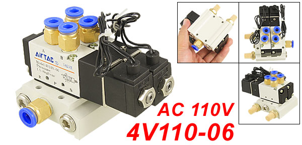 Details4V210-08 AC 110V 2 Position Single Head 2 Pneumatic Solenoid Valve w Base  Product Name 2 Solenoid Valve w Base Muffler Model 4V110-06 Working Pressure 0.15~0.8Mpa Working Voltage AC 110V Working Power 2.5VA Position & Way Number 2 Position 5 Way Base Size 5.8 x 5.6 x 2.3cm/2.3'' x 2.2'' x 0.9'' (L*W*T) Quick Fitting Inner Dia. Solenoid Valve: 0.6cm/15/64'' Base: 0.8cm/5/16'' Muffler Size 1.25 x 2.85cm/ 0.5'' x 1.1'' (Thread D* L) Mounted Hole Dia. 4mm/ 5/32" Total Size 9.6 x 9.2 x 6.4cm/3.8'' x 3.6'' x 2.5'' (L*W*H) External Material Metal, Plastic, Brass Color As Picture Shown Net Weight 402g Package Content 1 x 2 Solenoid Valve w Base Muffler
