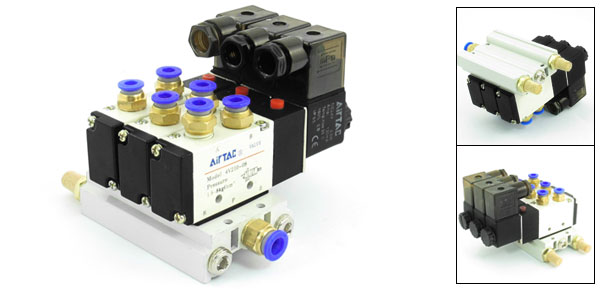 4V210-08 DC 24V 5 Way Triple Solenoid Valve Mufflers Quick Fittings Base Set