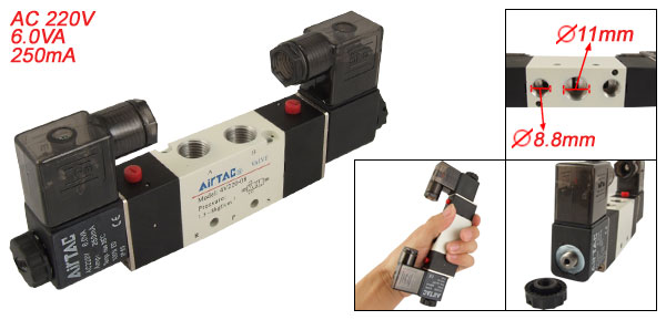 Port Size Inlet=Outlet=Exhaust=G1/8" Working Pressure 0.15~0.8MPa Type 5 Way 2 Position Power Consumption AC 220V 6.0VA Rated Current 250mA Temperature 35°C Maxi. Withstand Pressure 1.2MPa Threaded Port Size(Approx) Big: 11mm / 0.433" Small: 8.8mm / 0.346" Overall Size(Approx) 15.5 x 5.5 x 2.2cm / 6.1" x 2.2" x 0.9" (L*W*H) Color White, Black Net Weight 301g Package Content 1 x Solenoid Valve - Reviews