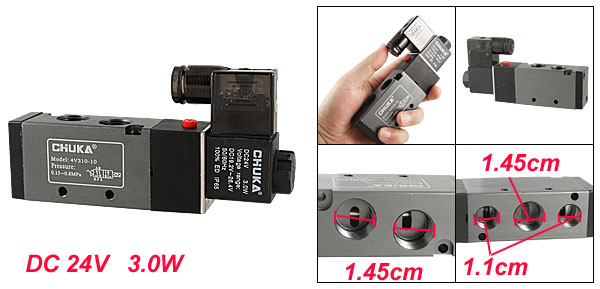 Type 5 Way 2 Position Single Head Type Power Consumption DC 24V, 3.0W Voltage Range DC 19.2V - 26.4V Pressure 0.15 -0.8MPa Joint Bore Size(Approx) Inlet=Outlet=PT3/8 Threaded Port Size(Approx) Air Inlet=Air Outlet=1.45cm / 0.571" Exhaust=1.1cm / 0.433" Hex Connector Inner Dia(Approx) 1.1cm / 0.433" Overall Size(Approx) 13.8 x 2.6 x 6.8cm / 5.4" x 1.0" x 2.6" (L*W*H) Color See the Picture External Materila Plastic, Metal Weight 277g Package Content 1 x Solenoid Valve - Reviews