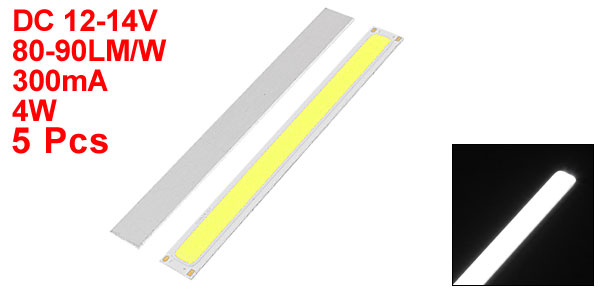 Product Name COB LED Lamp Beads Rated Voltage DC12-14V Luminous Flux 80-90LM/W Color Temperature 6000-6500K Power 4W Current 300mA Light Color White Material Aluminum Color Silver Tone, Yellow Diameter 140 x 15mm/ 5.5 x 0.6"(L*W) Luminous Surface 132 x 10mm/ 5.2" x 0.4"(L*W) Weight 52g Package Content 5 x COB LED Lamp Beads - Reviews