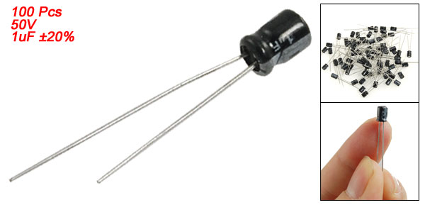 Product Name Aluminum Electrolytic Capacitor Quantity 100±2% Pcs Type Radial Lead Maximum Temperature 105°C Withstand Voltage 50V Capacitance 1µF Capacitance Tolerance ±20% Body Size 4 x 5mm / 0.16'' x 0.196" (D*L) Lead Spacing 2mm / 0.79'' Lead Length 27mm / 1.06'', 21mm / 0.83'' External Material Aluminum Weight 20g