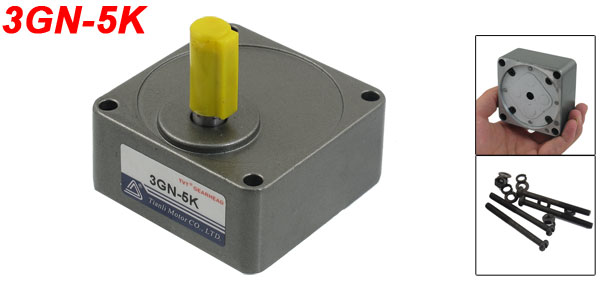 Product Name Gear Head Model 3GN-5K Reduction Ratio 5:1 Shaft Diameter 10mm/ 0.39" Base Hole Diameter 8mm/ 0.31" Mount Hole Diameter 5.5mm/ 0.22" Mount Hole Distance 58 x 58mm/ 2.28" x 2.28"(L*W)(Center to Center) Body Size 69 x 69 x 32mm/ 2.72" x 2.72" x 1.26" (L*W*H) Total Size 69 x 69 x 64mm/ 2.72" x 2.72" x 2.52" (L*W*H) Material Metal Color Gray Net Wieght 400g Package Content 1 x Gear Head