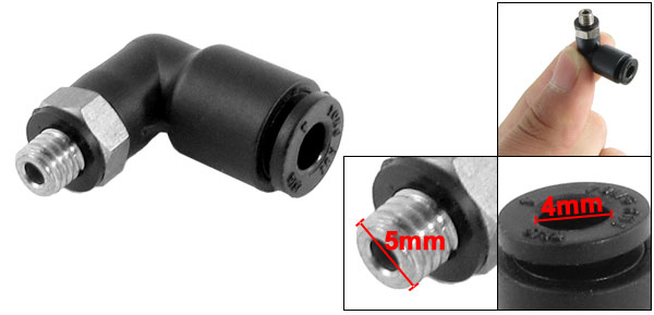 Product Name Pneumatic Quick Fitting Type Elbow Type One Touch Connector 4mm/ 5/32" Thread Connector 5mm/ 1/5" Material Plastic, Metal Size(Approx.) 2.1 x 2.1 x 1cm/ 0.8" x 0.8" x 0.4"(L*W*T) Main Color Black Weight 5g Package Content 1 x Pneumatic Quick Fitting - Reviews