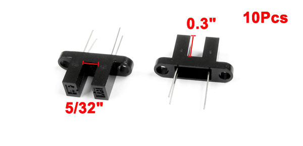 Details5/32" Slot PCB Photo Interrupter Sensor HY860D 10 Pcs  Product Name Slotted Optical Switch Model HY860D Output Type Photo Transistor Peak Emission Wavelength 940nm IR Diode Forward Current 50mA IR Diode Reverse Voltage 5V Transistor Power Dissipation 75mW Transistor Collector Current 20mA Photo Transistor Collector-emitter Voltage 30V Photo Transistor Emitter-collector Voltage 5V Diode Power Dissipation 100mW Operating Temperature Range 55-100 Celsius Degree Number of Pins 4 Slot Width 4mm/ 5/32" Slot Depth 8mm/0.3" Pin Length 10mm/0.4" Pitch 9mm/0.35", 2mm/0.08" Hole Dia. 3mm/0.12" Total Size 22 x 22 x 6mm/0.9" x 0.9" x 0.2"(L*W*H) Material Plastic, Metal Color Black Net Weight 10g Package Content 10 x Slotted Optical Switch w Bracket