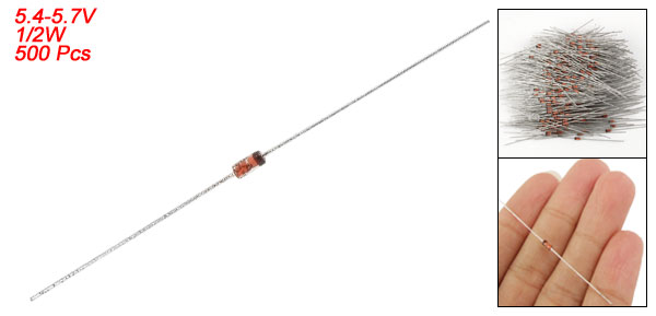Product Name Zener Diodes Model No. 6A3 Rating Power 1/2 W Zener Voltage 5.4-5.7V Size(Not Include Leads) 0.35 x 0.18cm / 0.138" x 0.071"(L*D) Leads Dia(Approx) 0.04cm / 0.016" Overall Length(Approx) 6cm / 2.4" Color See the Picture Weight 63g Package Content 500(±2%) Pcs of Zener Diodes - Reviews