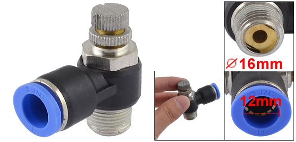 Product Name Pneumatic Speed Controller Inner Diameter (Blue End) 12mm / 15/32" Thread Outer Diameter 16mm / 5/8" Total Size 47 x 48 x 13mm / 1.86" x 1.89" x 0.51" (L*W*T) Material Plastic, Metal Color Blue, Black, Silver Tone Weight 34g Package Content 1 x Speed Controller  - Reviews
