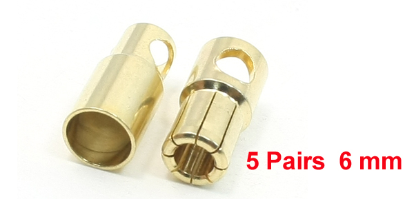 Product Name Banana Bullet Connector Material Metal Color Gold Tone Male Length 14 mm / 0.55" Female Length 15mm/ 0.6" Male Diameter 6 mm / 0.24" Female Inner Diameter 6 mm / 0.24" Weight 19g Package Content 5 Pairs x Banana Bullet Connector - Reviews