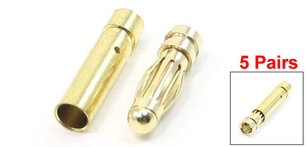 Product Name Banana Bullet Connector Material Metal Color Gold Tone Male Length 13 mm / 0.5" Female Length 14 mm/ 0.55" Male Diameter 3 mm / 0.11" Female Inner Diameter 3 mm / 0.11" Weight 8g Package Content 5 Pairs x Banana Bullet Connector - Reviews