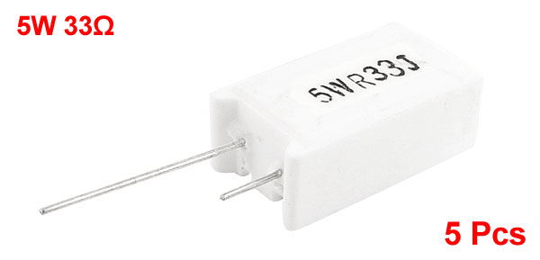 Details5 Pcs 0.33 Ohm 5 Watt Wirewound Radial Cement Resistors White  Product Name Cement Resistor Body Material Ceramic, Cement Power 5W Resistance 0.33 Ohm Tolerance ±5% Body Size (Approx.) 25 x 13 x 9mm/1'' x 0.5'' x 0.35'' (L * W * H) Pin Size (Approx.) 11 x 0.7mm / 0.43'' x 0.03"(L*D) Pin Spacing 5mm/0.2'' Color White Weight 30g Package Content 5 x Cement Resistors