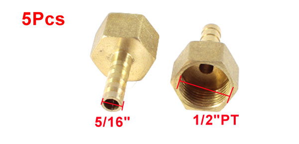 Product Name Female Hose Barb Design Straight Barb End Outside Diameter 8mm/5/16" Female Thread Size 1/2"PT Overall Size 40 x 26 x 5.5mm / 1.6" x 1" x 0.2"(L*Max.Outside D*Inner D) Material Brass Color Gold Tone Weight 130g Package Content 5 x Female Hose Barb - Reviews