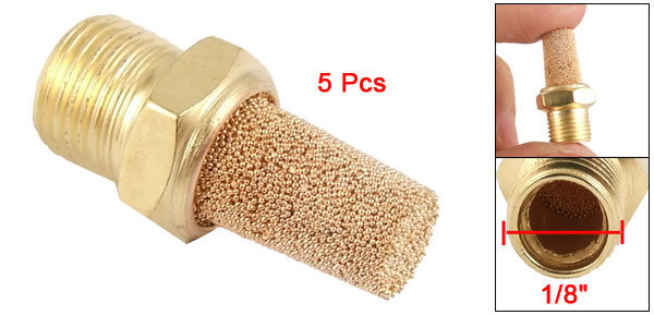 1/8" BSP Total Size 24 x 15mm/0.9'' x 0.6'' (L*W) Material Metal Color Gold Tone Net Weight 29g Package Content 5 x Pneumatic Muffler - Reviews