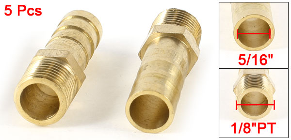 Product Name Male Hose Barb Design Straight Barb End Outside Diameter 8mm/5/16" Male Thread Size 1/8"PT Overall Size 30 x 11 x 6.7mm / 1.2" x 0.4" x 0.3"(L*Max.Outside D*Inner D) Material Brass Color Gold Tone Weight 27g Package Content 5 x Male Hose Barb - Reviews