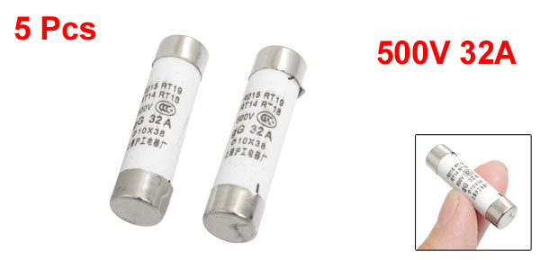 Product Name Cylindrical Fuse Model R015-32 Material Metal, Ceramic, Electronic Parts Rated Voltage 500V Rated Current 32A Main Color White, Silver Tone Size 10 x 38mm/0.39" x 1.4" (D*L) Weight 28g Package Content 5 x Cylinder Caps Fuse - Reviews