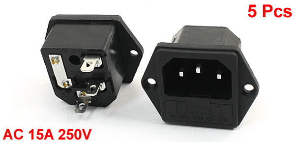 Details5 Pcs 10A 250VAC 3Pins Fuse Holer IEC 60320 C14 Inlet Male Power Plug  Product Name Male Power Plug Power Supply AC 15A 250V Inlet Plug Type IEC60320 C14 Terminals Number 3 Total Size(Approx) 43 x 33 x 30mm/ 1.7" x 1.3" x 1.2" (L*W*T) Fit for Fuse Size 20 x 5mm / 0.8" x 0.2" (L*W) Mouting Hole Dia. 3.8mm / 0.15" Material Plastic , Electronic Parts Color Black Total Weight 82g Package Content 5 x Male Power Plug