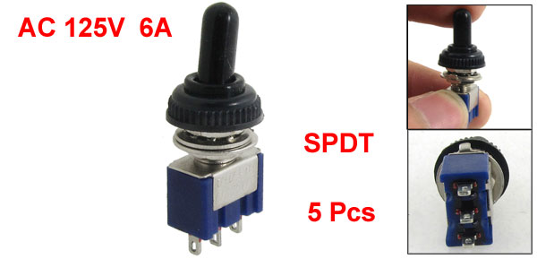 AC 125V, 6A Pin Number 3 Pins Position 3 Positions(ON/OFF/ON) Type SPDT(Latching) Cap Diameter 13.6mm / 0.5" Body Size(Approx.) 13 x 8 x 9.7mm / 0.5" x 0.3" x 0.38"(L*W*T) Total Height 36mm / 1.4" Material Plastic, Metal, Rubber Weight 31g Package Content 5 Pcs x Toggle Switch - Reviews