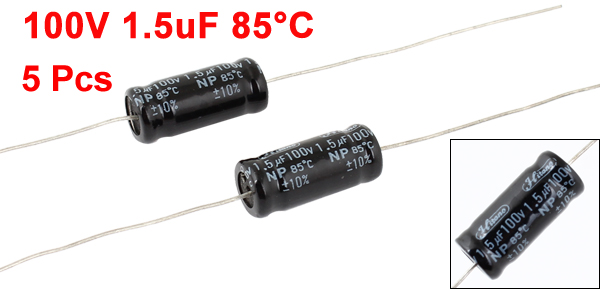 Product Name Electrolytic Capacitor Type Radial Lead Features Standard General Purpose Maximum Temperature 85°C Withstand Voltage 100V Capacitance 1.5uF Body Size 8 x 20mm / 0.3'' x 0.79'' (D*L) Lead Length 55mm/ 2.2'' Dielectric Material Aluminum Weight 8g Color Black Package Content 5 Pcs x Electrolytic Capacitors - Reviews