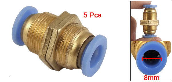 Details5 Pcs 16mm Thread Pneumatic Fitting Quick Joint Coupler  Product Name Pneumatic Quick Coupler Material Plastic, Metal Thread Diameter 16mm/0.63'' Inner Diameter (Blue End) 8mm/0.31'' Total Size (Each ) 32 x 23mm/1.3'' x 0.9'' (L*W) Color Blue, Gold Tone Weight 96g Package Content 5 x Pneumatic Quick Coupler