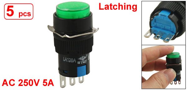 5 Pcs 1NO 1NC Round Green Latching Push Button Switch AC 250V 5A