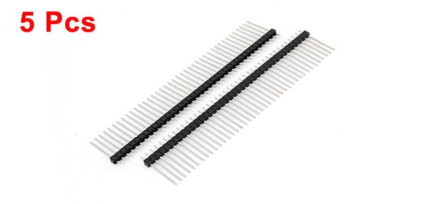 Details5 Pcs 2.54mm Spacing 40 Position 1 Row Flat Angle Male PCB Pin Header  Product Name Pin Header Position 40 Row 1 Mounting Angle Flat Angle Pin Pitch 2.54mm Total Size 101 x 2.5 x 21mm/ 3.9" x 0.1" x 0.8"(L*W*H) Material Plastic, Metal Color Black, Silver Tone Weight 18g Package Content 5 x Right Angle Pin Header
