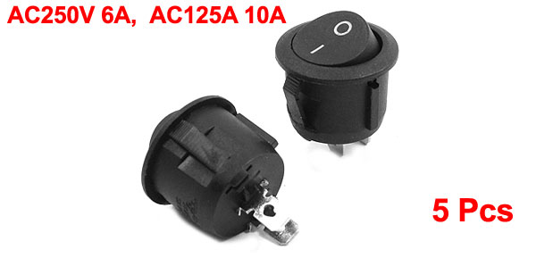 5 Pcs 2 Pin ON-OFF SPST Round Snap in Rocker Switch Black AC 250V 6A Plug